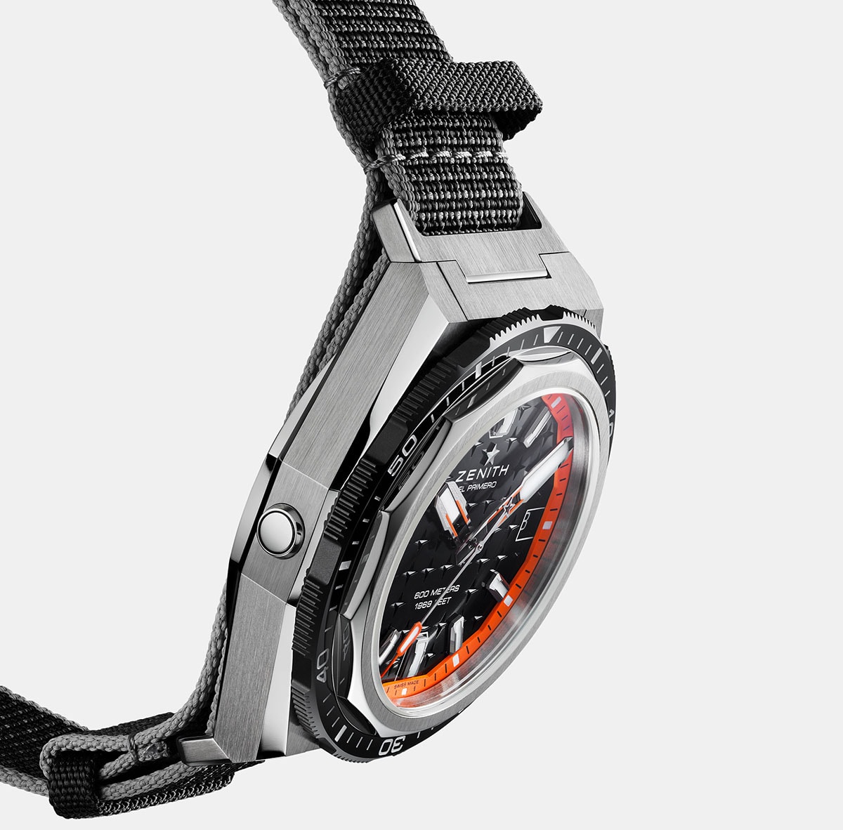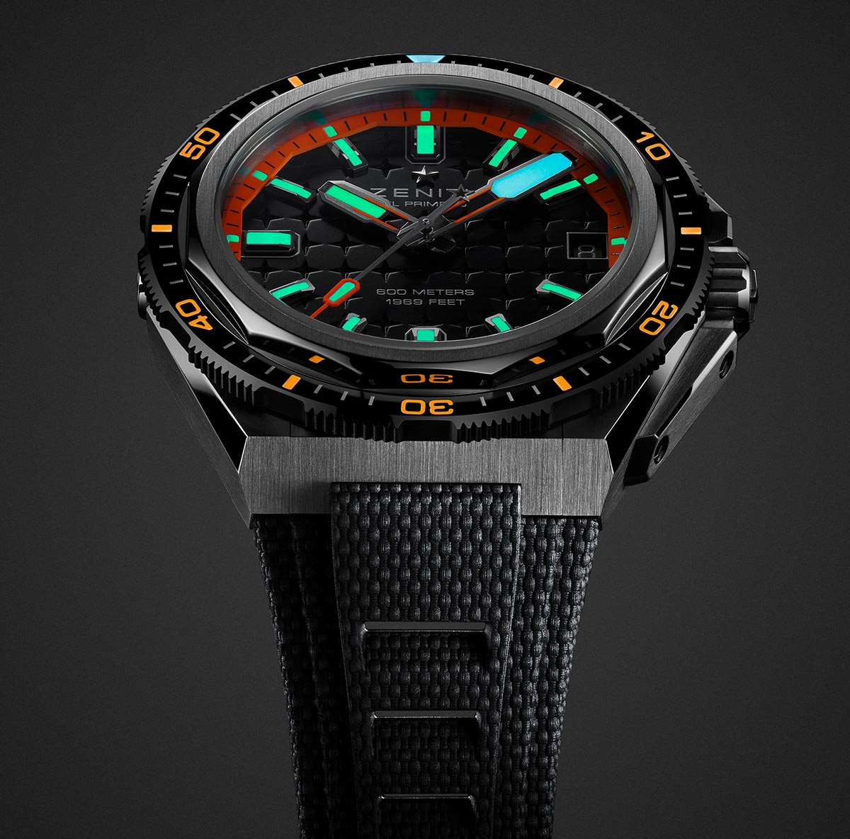 Zenith ekskluzivni ronilački model nudi u nizu zanimljivih opcija, među kojima smo odabrali klasični crni ciferblat sa atraktivnim narandžastim rubom. U skladu sa nasleđen, crni brojčanik nastupa s uzorkom zvezde te dvobojnim luminiscentnim markerima i kazaljkama. Na polju tri sata je prozor datuma skladno uklopljen u ergonomiju brojčanika.