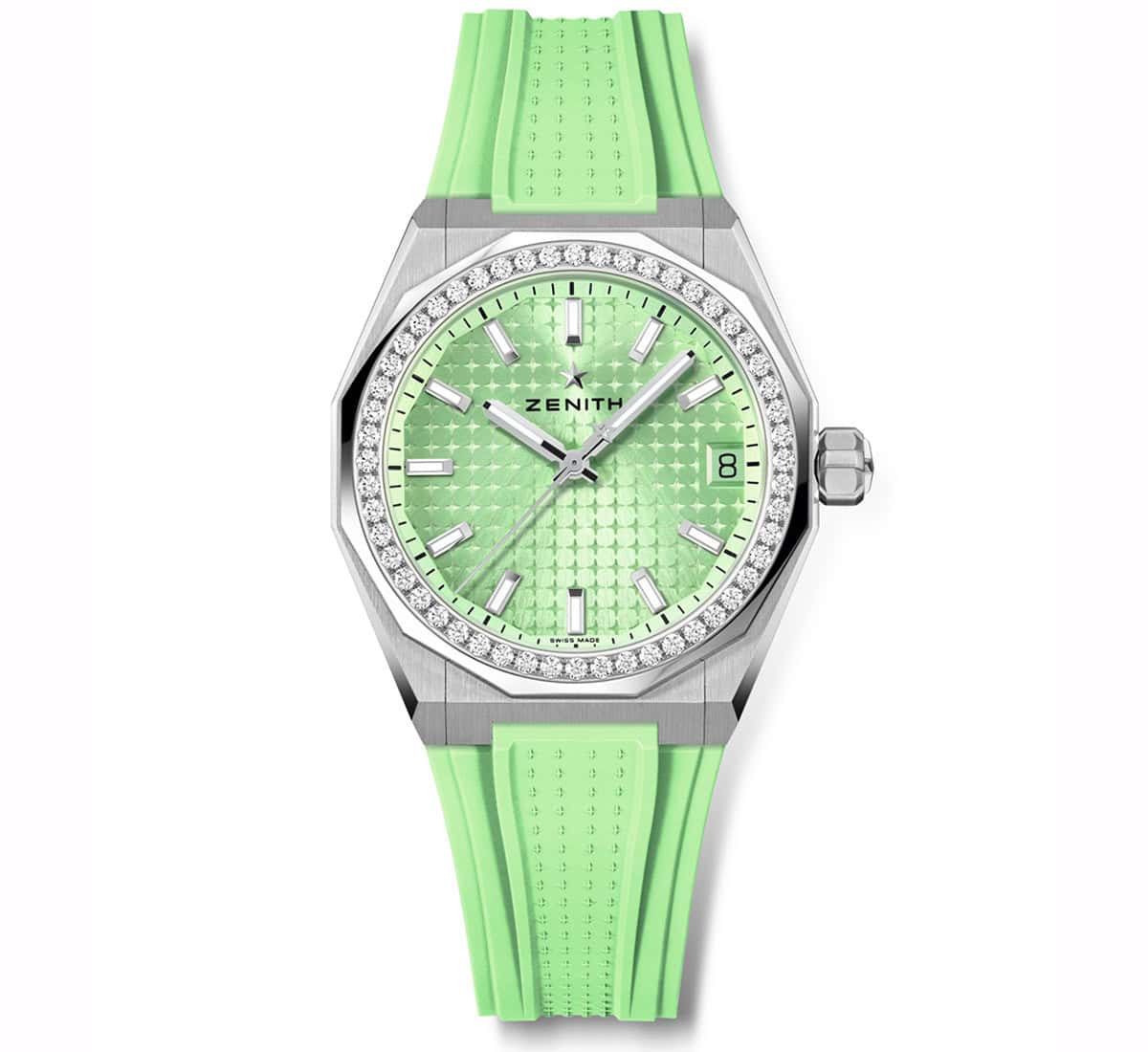 Damama koje ne žele da se odreknu luksuza Zenith preporučuje Defy Skyline 36, sat koji nastupa u osmougaonom čeličnom kućištu od 36 milimetara.Uprkos sportskom dizajnu, Zenith se opredelio za fasetiranu koronu s dijamantima koji ističu onu drugu, ekskluzivnu stranu konstrukcije.