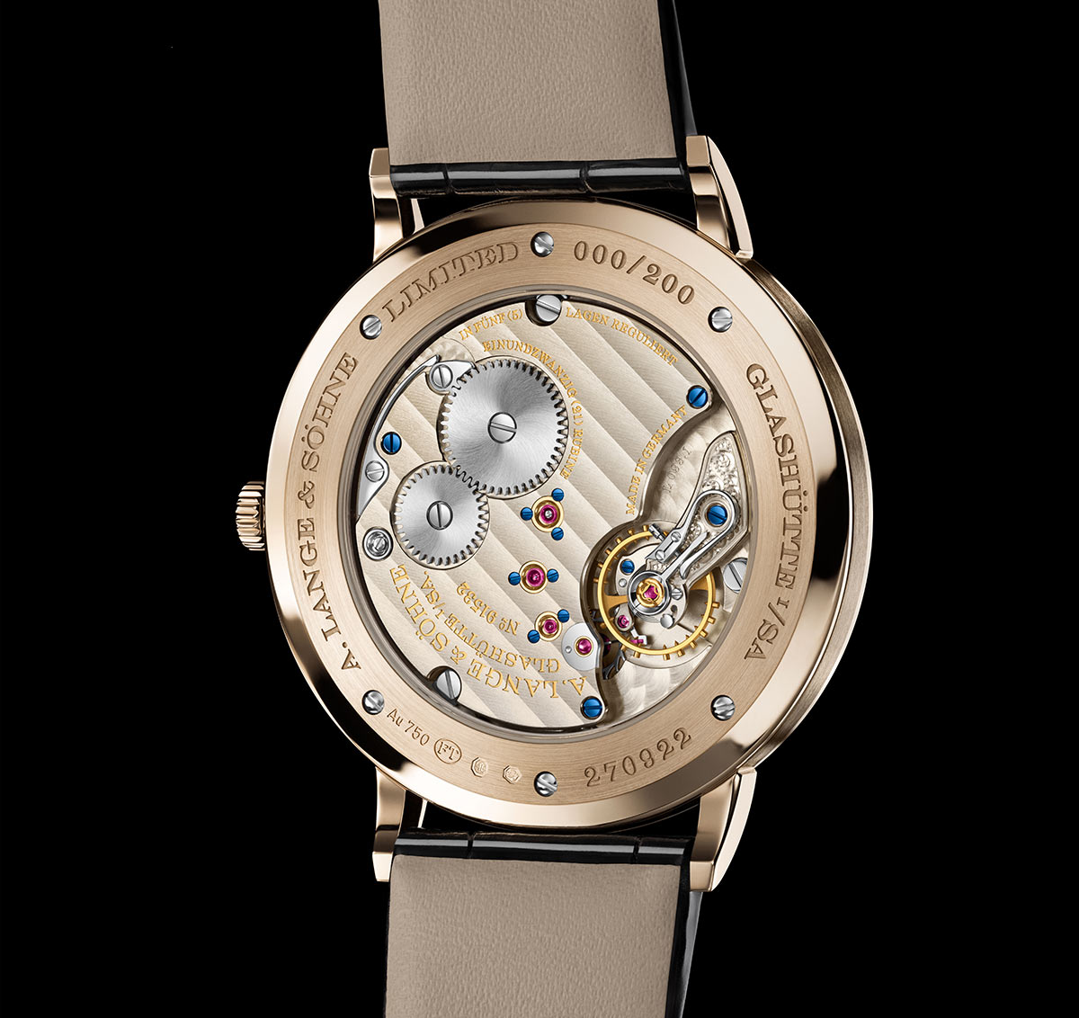 Kroz safirno zadnje staklo vitkog kućišta vidljiv je manufakturni kalibar L093.1, Langeov najtanji mehanizam koji je visok samo 2,9 mm ali uprkos tome ima čak 167 minuciozno kreiranih elemenata.