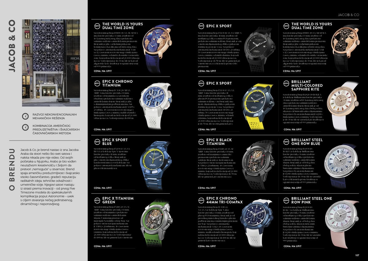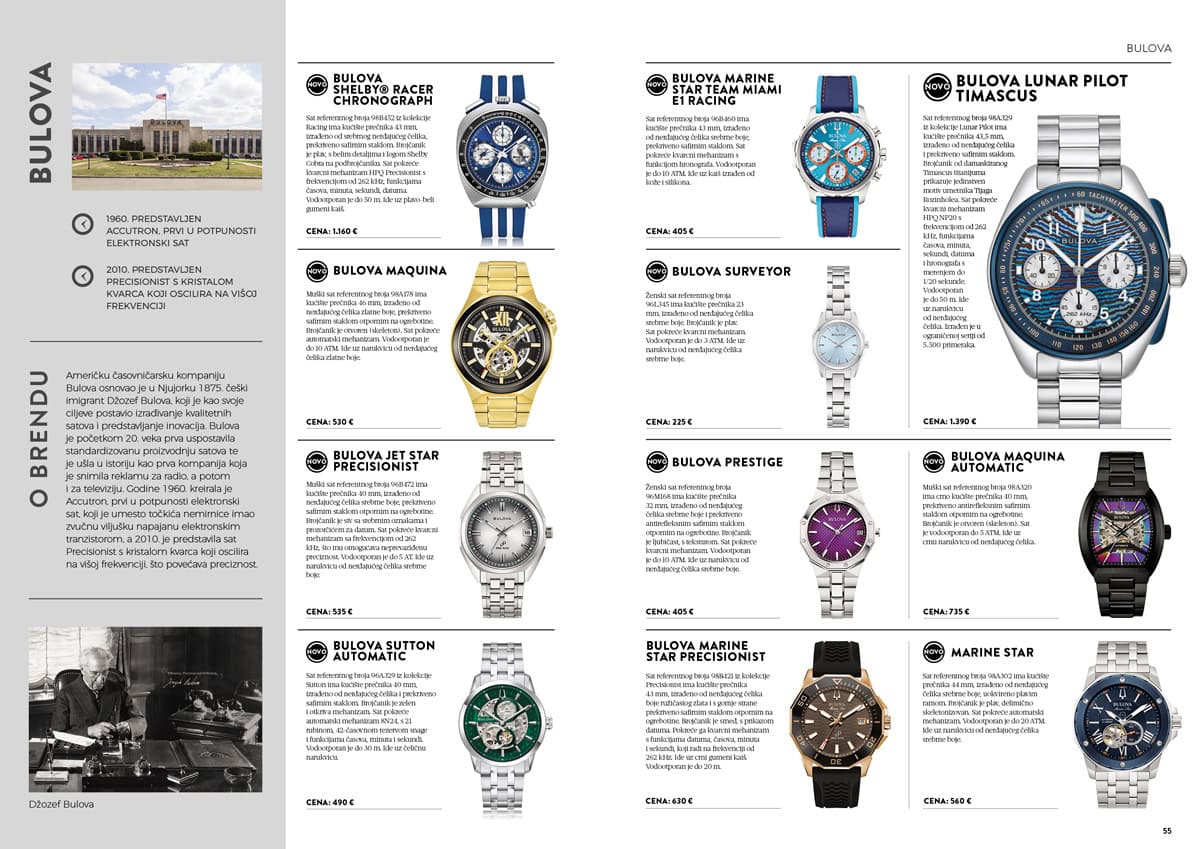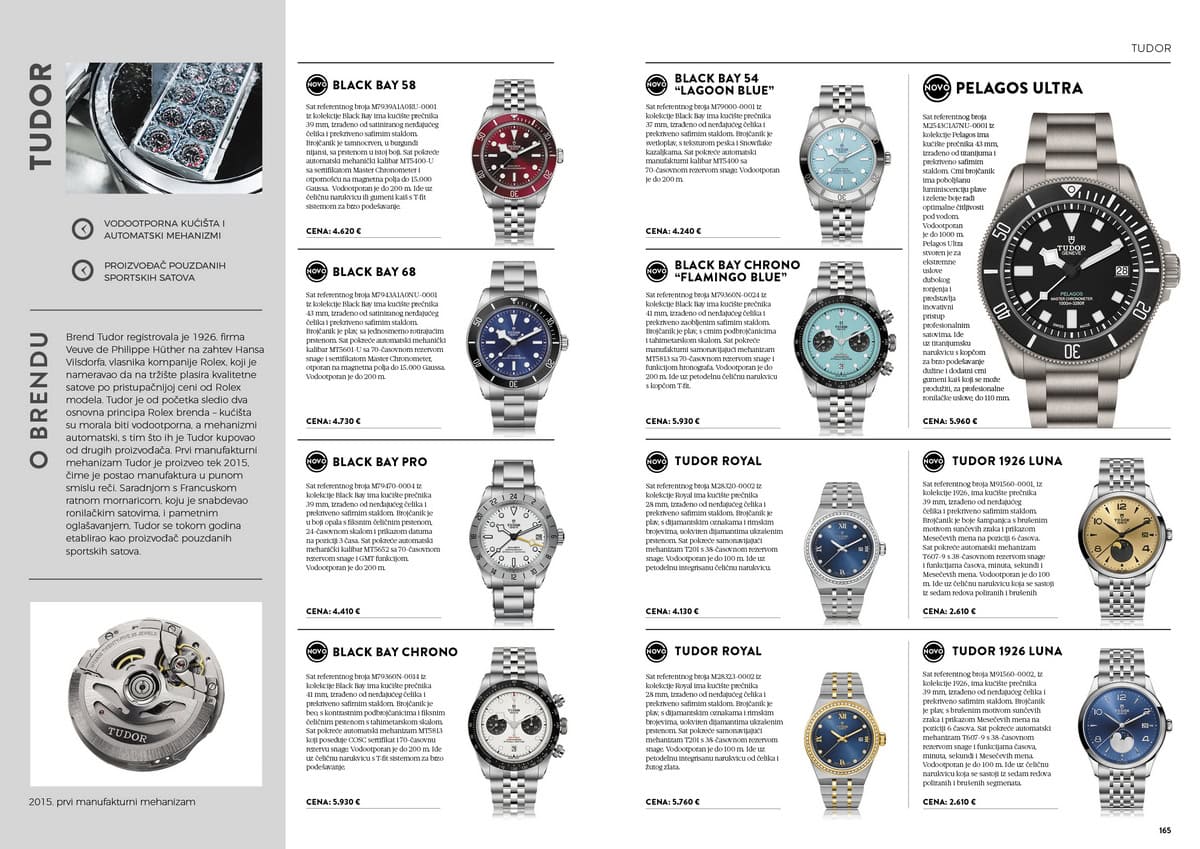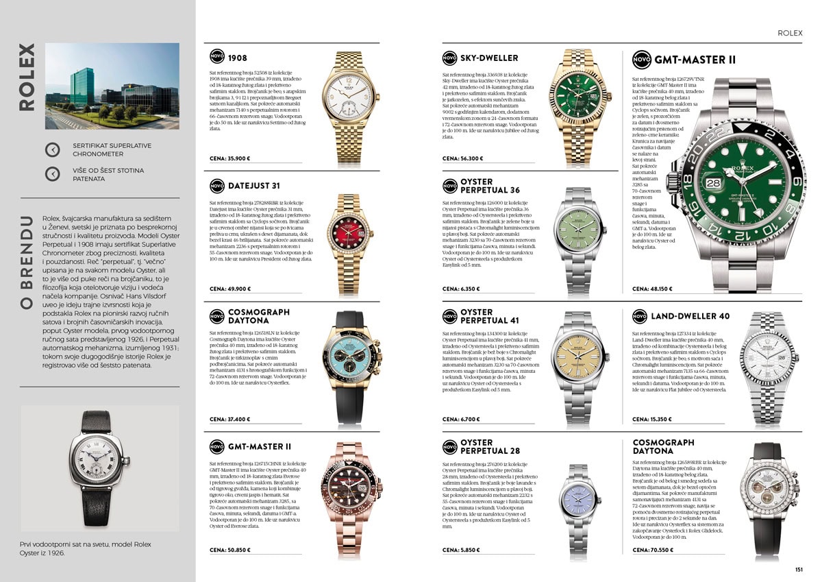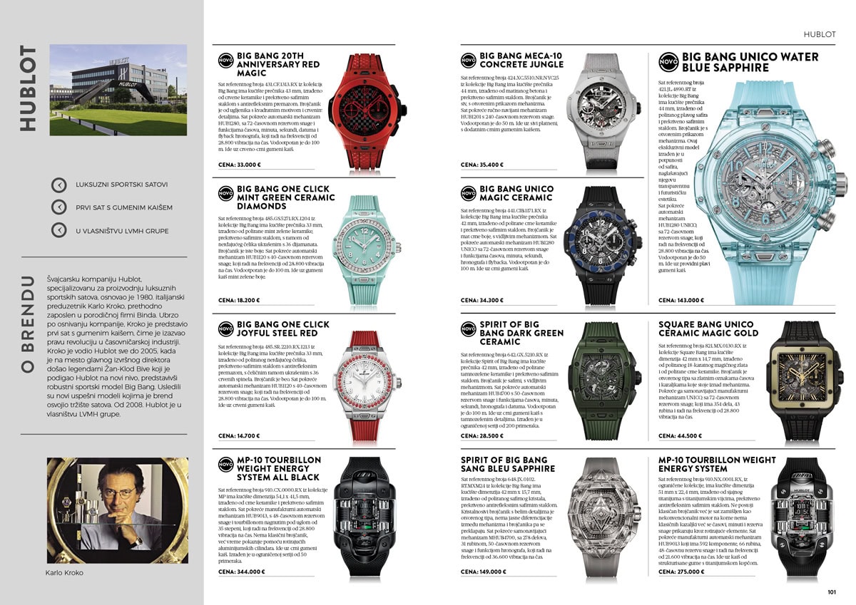 U ovogodišnjem izdanju nalazi se više od osamsto modela ručnih satova, jasno predstavljenih kroz fotografije, tehničke karakteristike i maloprodajne cene. Mehaničke komplikacije, sportski hronografi, elegantni klasici, kvarcni i hibridni modeli – ponuda je raznovrsna, a trendovi za 2026. godinu posebno ističu titanijum, keramiku, bronzu, čelik, kao i nove pristupe oblikovanju brojčanika i kućišta.