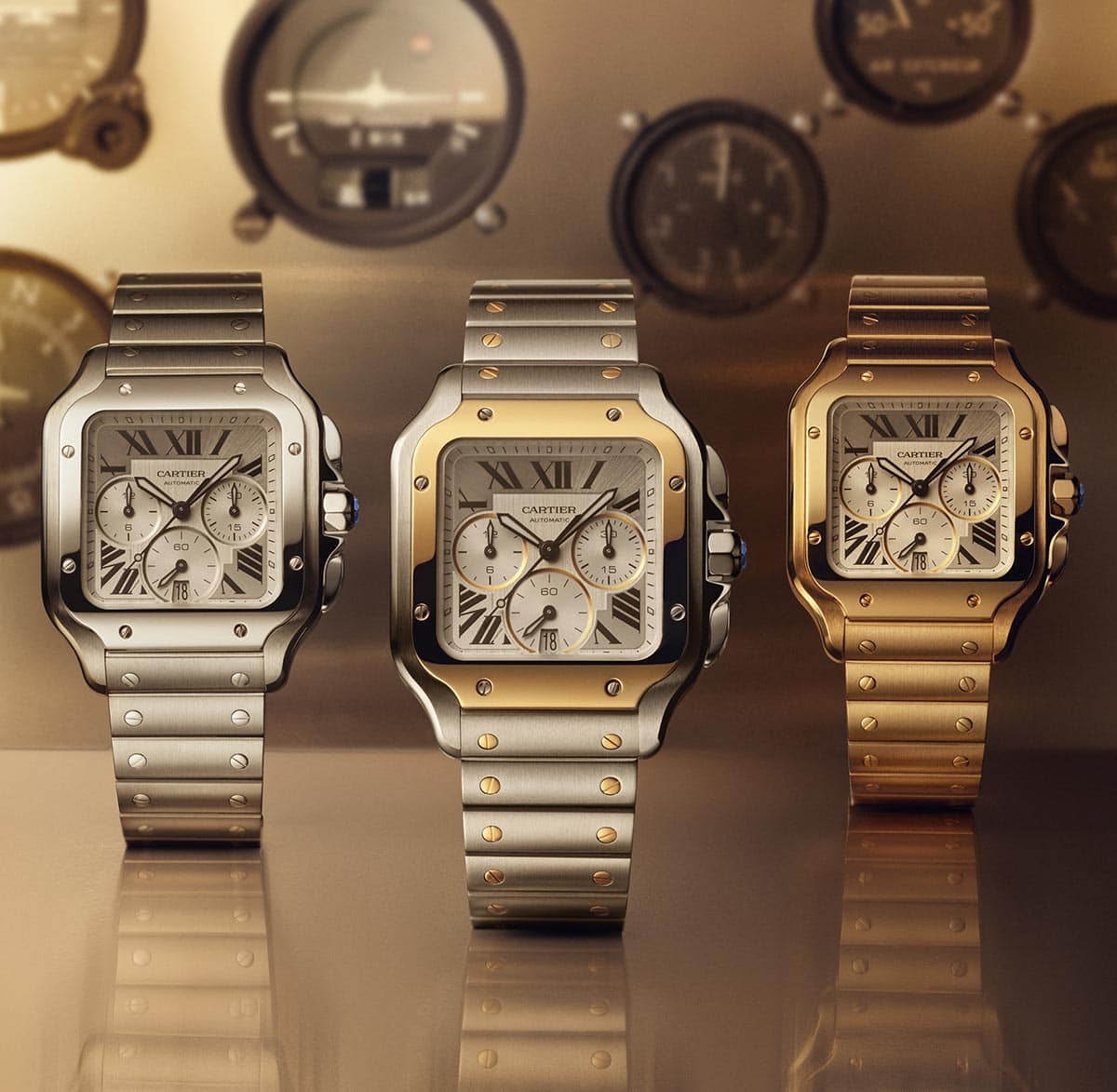 Santos de Cartier Chronograph u Ženevi se vraća modelu prvi put lansiranom 2020. godine, sada u LM veličini, tj. dimenzijama 47,5 x 39,8 mm, s visinom od 11,6 milimetara. Dostupan u žutom zlatu, žutom zlatu i čeliku te čeliku, elegantni hronograf do savršenstva dovodi temu svakodnevne nosivosti i performansi. Brojčanik ističe voljeni stil Cartier satova, a u njega su skladno uklopljeni i registri brojčanika. Kao dodatak tu je i Super-LumiNova® tehnologija za čitljivost pri slabom osvetljenju.