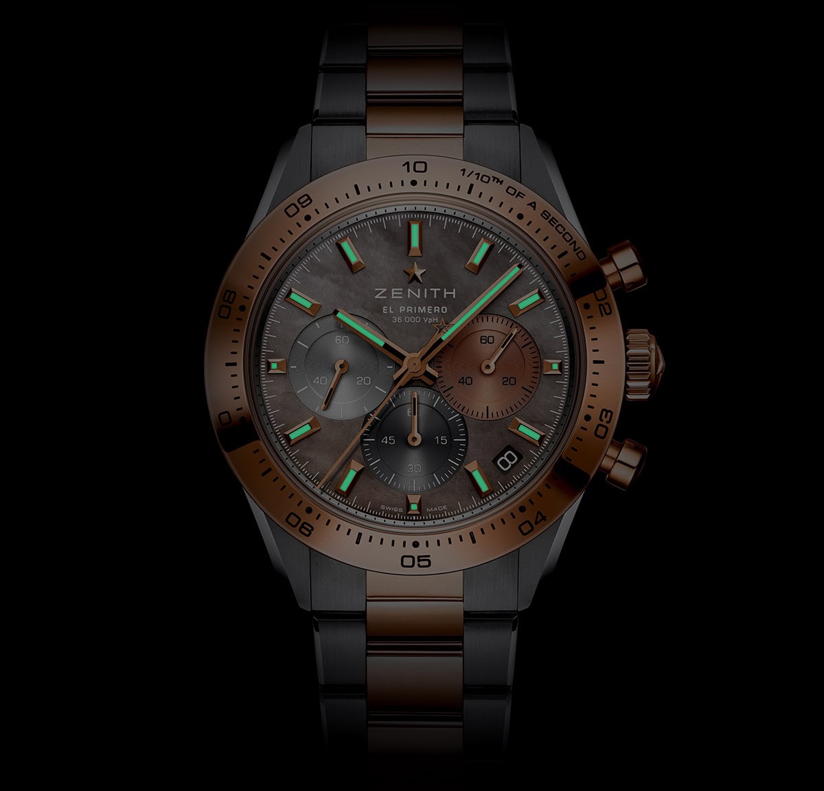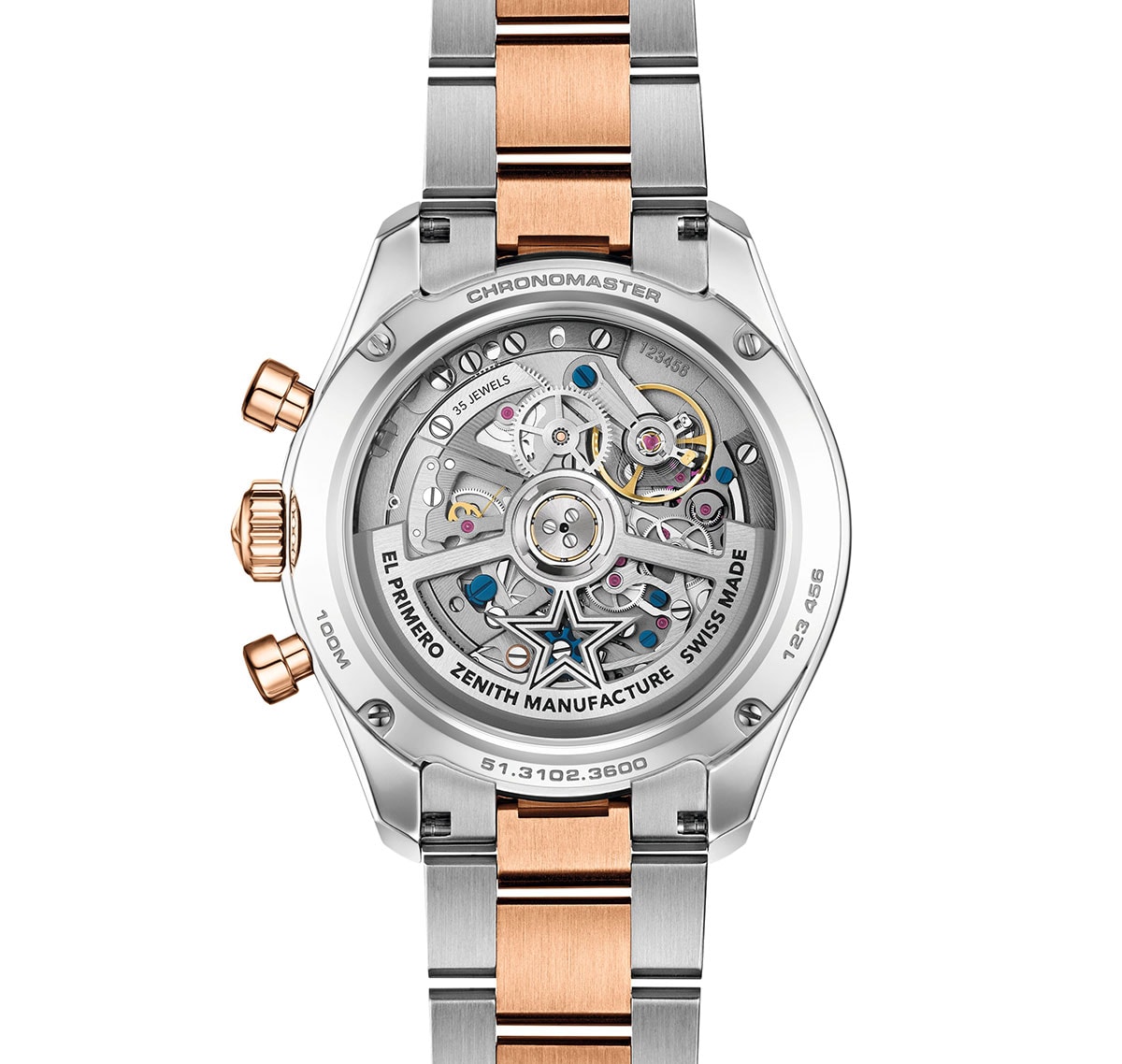 Najnovija referenca povezana je na integrisanu narukvicu od čelika i ružičastog zlata čime je nastavljena tema kontrasta. Naizmenične brušene i polirane površine naglašavaju strukturu, a središnja karika od ružičastog zlata ekskluzivni karakter. Zenith je po običaju mislio na sve, pa je narukvica opremljena sigurnosnom dvostrukom preklopnom kopčom.